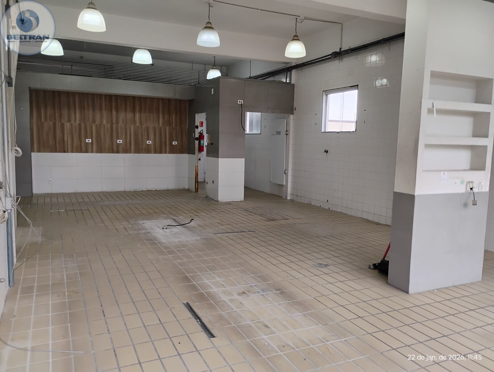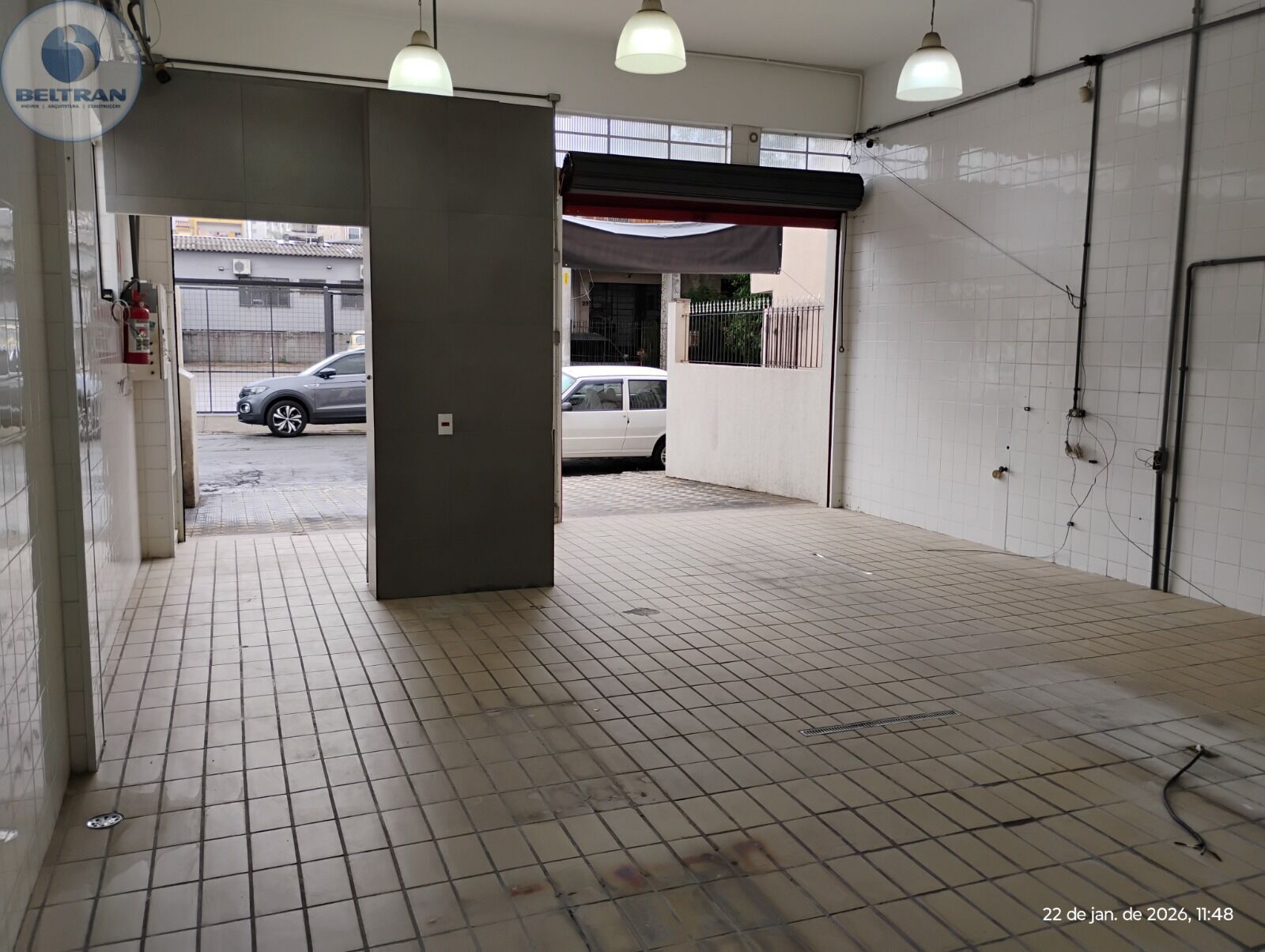 Salão em vão livre com instalações para área alimentícia, Revestimentos em azulejos até o teto, Pé-direito: 3,8 m, Copa, 2 W.C. , Entrada Trifásica, Câmara para Resfriamento / Congelamento contendo 39,00 m³ com equipamento principal e reserva em funcionamento.
